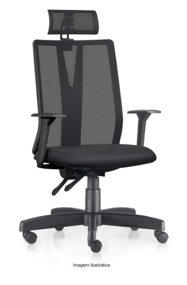 Encosto em tela dublada, permite maior durabilidade pois é feita por processo vulcanizado tornando o tecido e a tela uma peça unica, fixada a um estrutural produzido em polímero injetado de alta resistência, com apoio de cabeça ajustável na angulação, altura e profundidade, sendo também em tela.